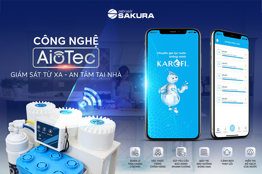 Công nghệ Aiotec là hệ thống tự động kiểm soát chủ động được nhà sản xuất Karofi tích hợp vào từng lõi lọc. Đồng thời cho phép kết nối hoạt động của máy lọc nước với một nền tảng app điện thoại có tên là Karofi 360.